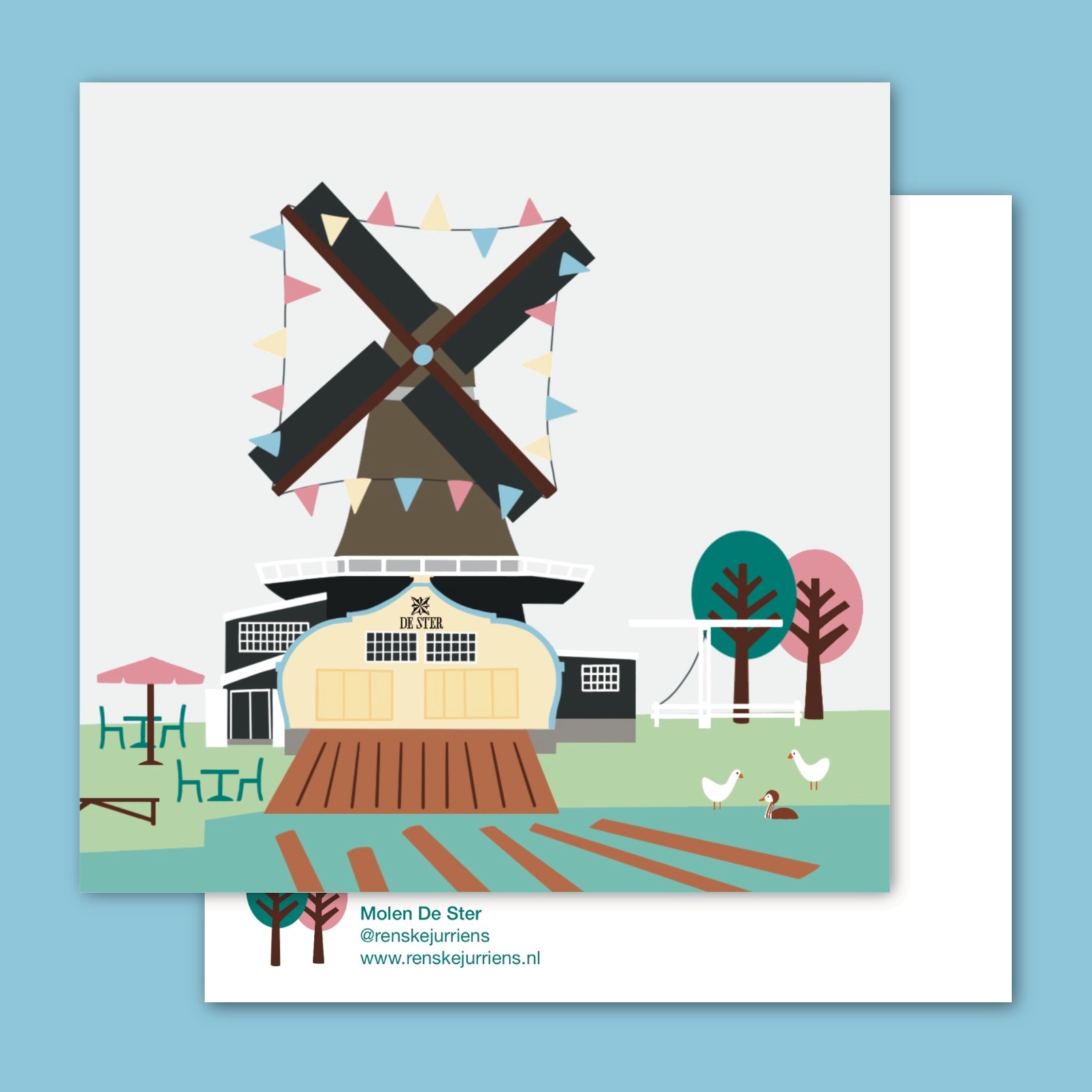 De kleuren kunnen in het echt wat afwijken. Elk beeldscherm is anders. En de kaarten en posters verpak ik met zorg. Soms komt er wel eens een kaart aan met een vouwtje. Twijfel dan niet en stuur even een berichtje.
